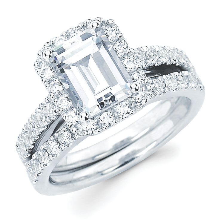 Halo Bridal: 1/2 Ctw. Diamond Halo Semi Mount available for 2 Ct. Emerald Cut Center Diamond in 14K Gold Engagement ring and wedding band sold separately