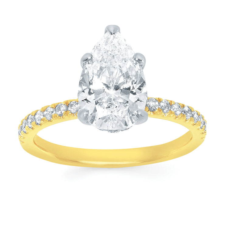 Classic Bridal: Hidden Halo Diamond Shank 1/4Ctw. Diamond Semi Mount shown with 2 Ct. Pear Center Diamond in 14K Gold Engagement ring and wedding band sold separately