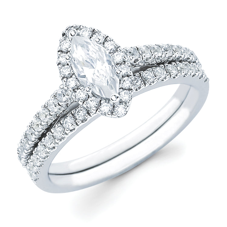 Halo Bridal: 1/3 Ctw. Diamond Halo Semi Mount available for 1/2 Ct. Marquise Cut Center Diamond in 14K Gold 1/5 Ctw. Diamond Wedding Band in 14K Gold Items also available to purchase separately