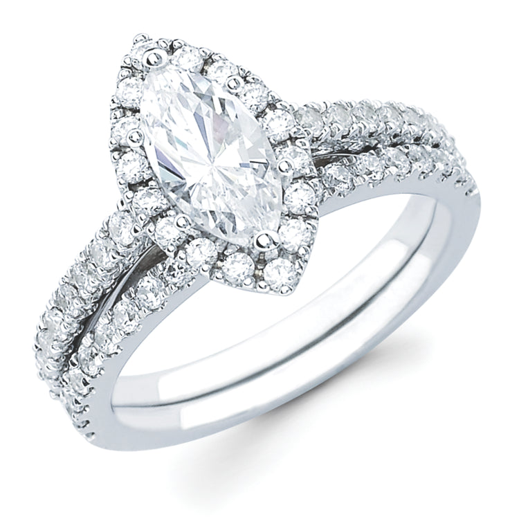 Halo Bridal: 1/2 Ctw. Diamond Halo Semi Mount available for 1 Ct. Marquise Cut Center Diamond in 14K Gold 1/4 Ctw. Diamond Wedding Band in 14K Gold Items also available to purchase separately