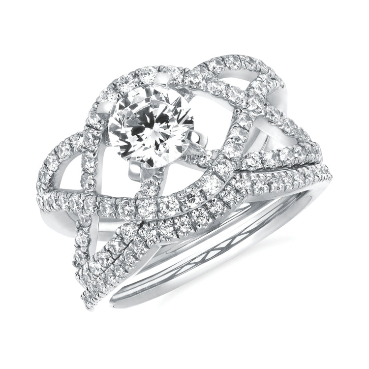 Modern Bridal: 3/4 Ctw. Diamond Orbit Split Shank Semi Mount shown with 1 Ct. Round Center Diamond in 14K Gold 1/10 Ctw. Diamond Wedding Band in 14K Gold Items also available to purchase separately
