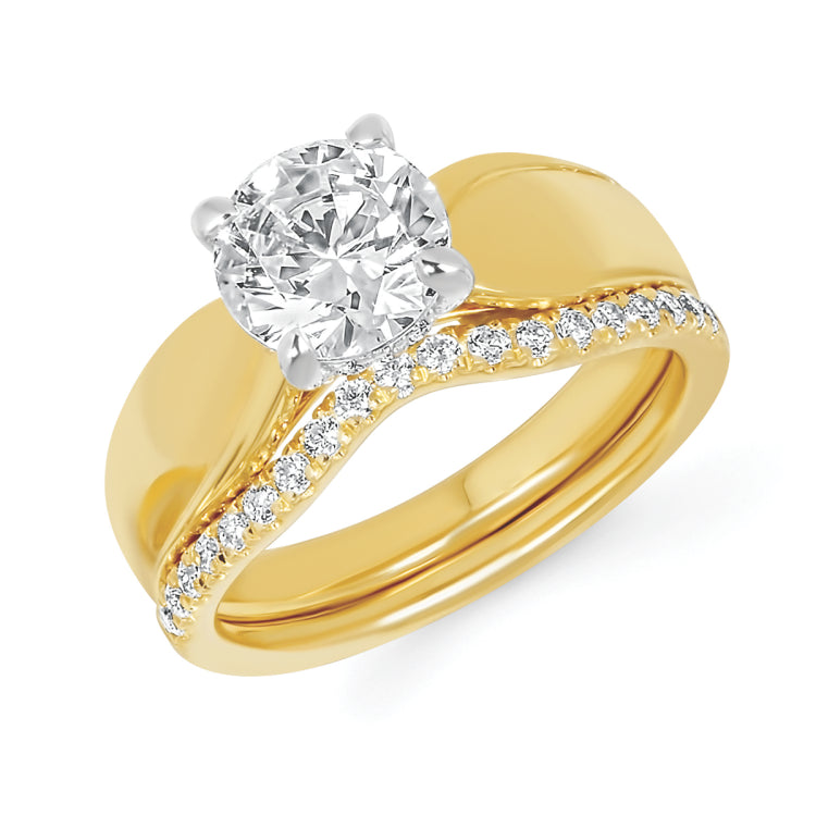 Modern Bridal: 0.06 Ctw. Diamond Semi Mount shown with 1 1/2 Ct. Round Center Diamond in 14K Gold 1/5 Ctw. Diamond Wedding Band in 14K Gold Items also available to purchase separately
